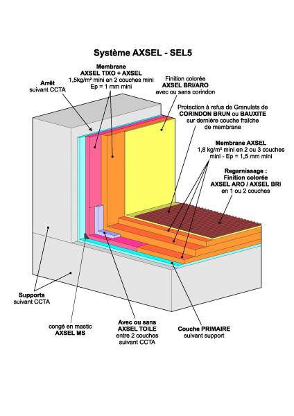 Globalement, l'épaisseur minimale du système d'étanchéité proposée avec le produit AXSEL SEL5 est supérieure ou égale à 2,5mm.