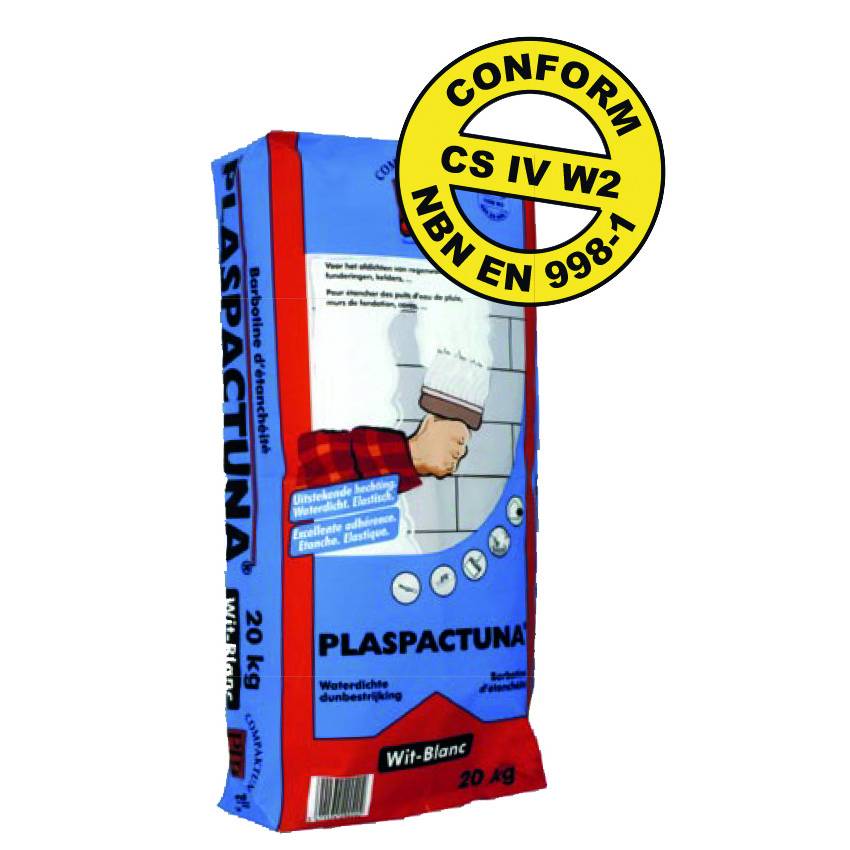 - Pour obtenir un badigeonnage de PLASPACTUNA, la poudre sèche est gâchée avec 25 à 30% d'eau(5 à 6L d'eau sur 20 kg de produit) jusqu'à ce que soit obtenue une masse épaisse exempte de grumeaux. On laisse reposer cette masse pendant 15 minutes et, ensuite, elle est une nouvelle fois mélangée intensivement. PLASPACTUNA s'applique avec une brosse large, jusqu'à ce que l'on obtienne une couche épaisse uniforme et exempte de pores. Une deuxième couche est appliquée après avoir éventuellement humidifié légèrement la première couche et avant que celle-ci ne soit trop durcie (p.ex. le jour suivant).